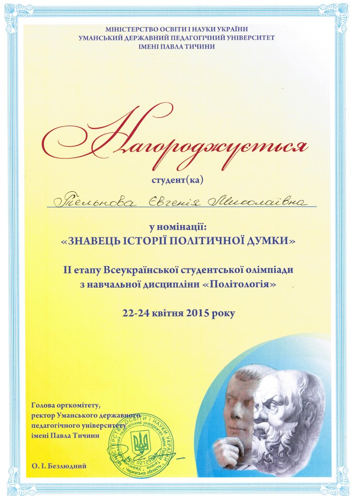 Тельнова Євгена нагороджена грамотою в номінації «Знавець історії політичної думки».