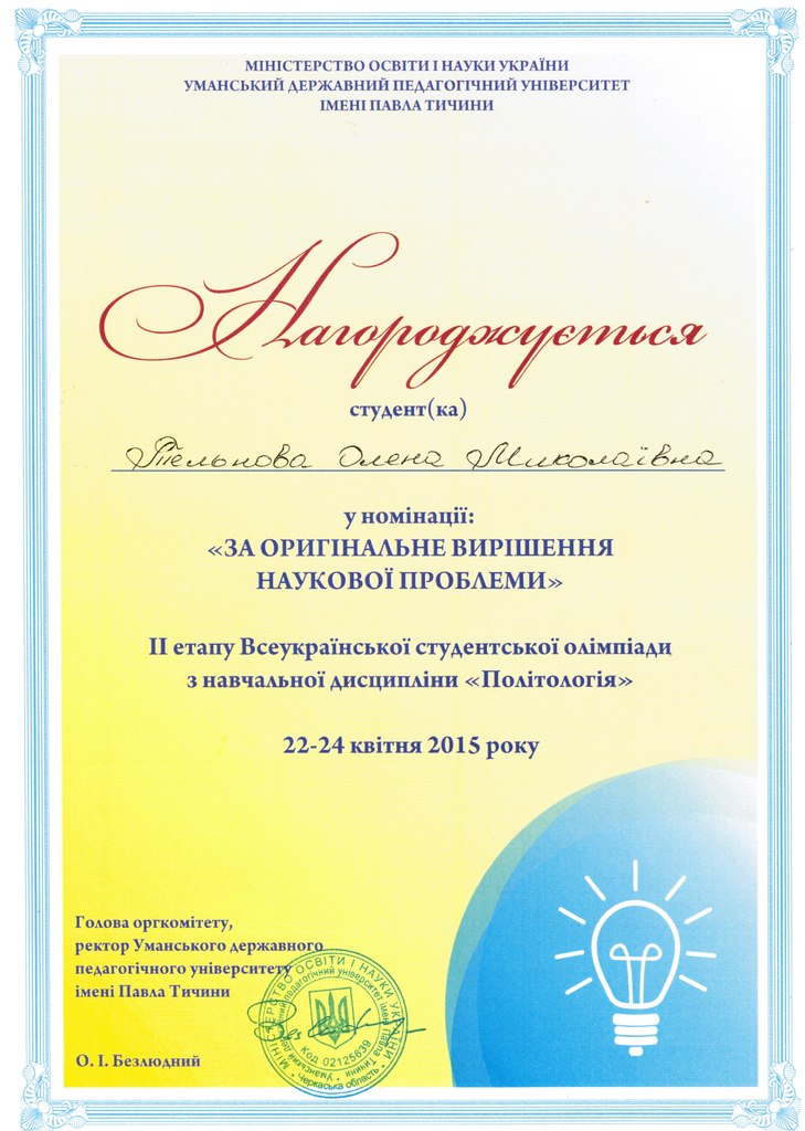 ПОЗДРАВЛЯЕМ Тельнову Алену и Тельнову Евгению, студенток IV курса технологического факультета, которые принимали участие во ІІ этапе Всеукраинской олимпиады по «Политологии» в Уманьском государственном педагогическом университете им. Павла Тычины.